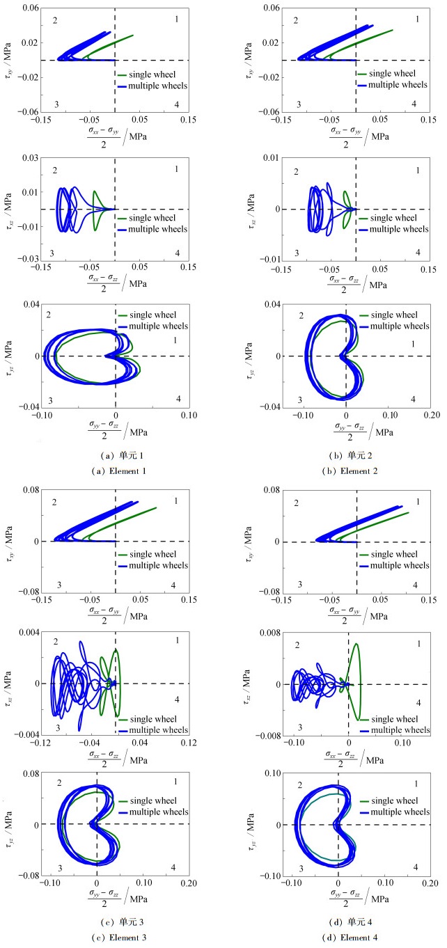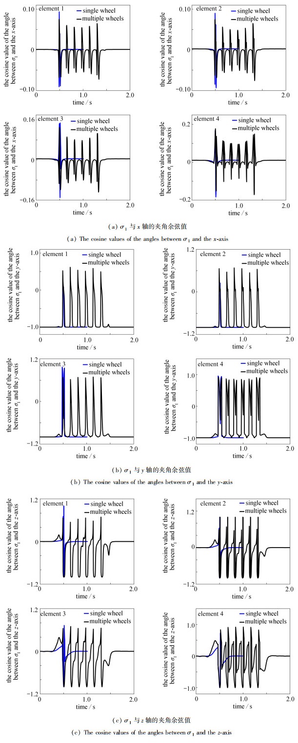 为揭示单次和多次荷载作用下主应力大小和方向变化对沥青路面的损伤机理,该文采用有限元软件构建了沥青路面结构模型,研究了不同轴载个数作用下沥青路面结构单元的应力路径以及主应力方向余弦变化规律. 结果表明:在单次和多次荷载作用下,路面结构单元的应力路径和主应力轴旋转强度时刻发生变化. 在荷载移动的过程中,车轮每经过考察断面一次,主应力对应的方向余弦将出现正、负交替转换,且由于不同车轮之间相互作用,导致不同车轮对应的方向余弦正峰值和负峰值不同. 第一主应力的方向余弦值沿横向和纵向均发生了瞬时正、负交替转换,表明在车辆加载的过程中主应力方向发生了突变,且在多轮作用下的交替更为复杂. 在长期的循环荷载作用下,容易导致路面出现裂缝.