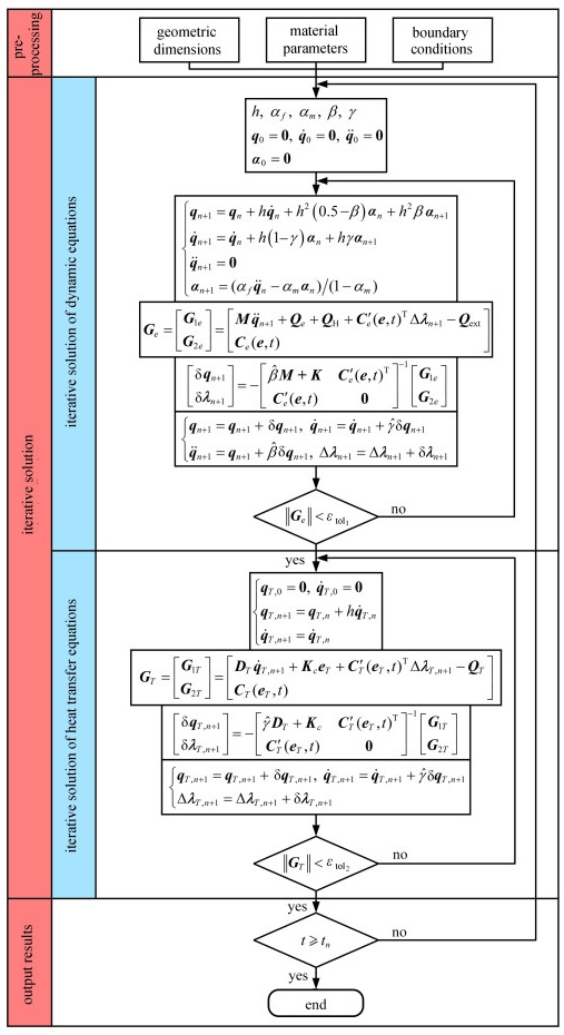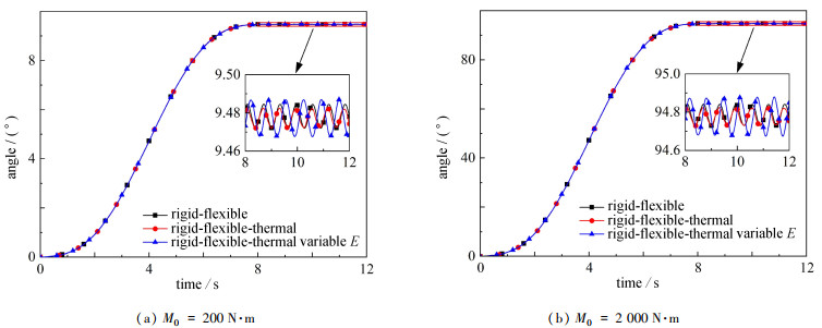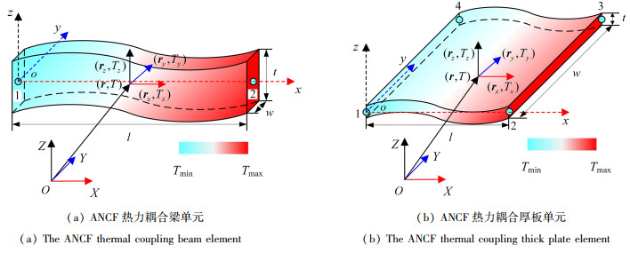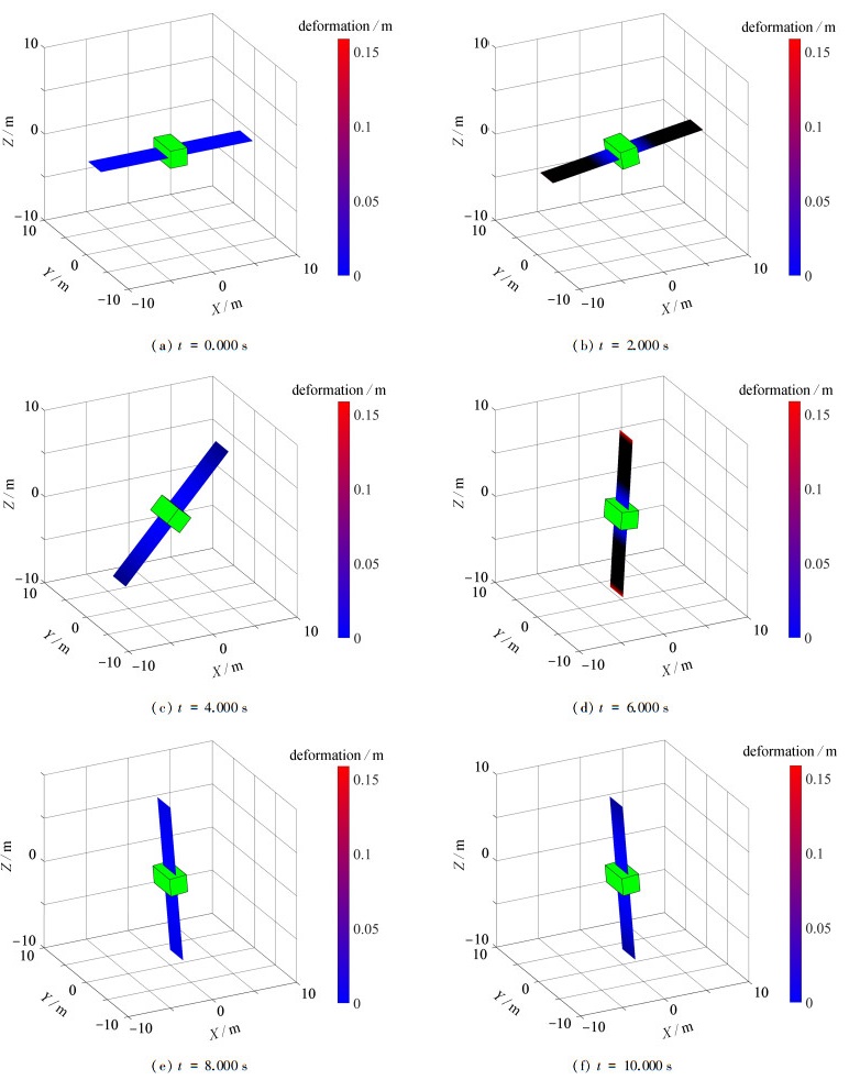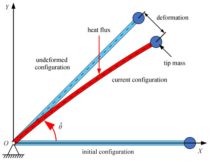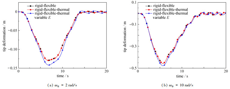 航天器在太空执行任务期间会受到复杂空间热环境载荷影响,导致其柔性结构的温度场发生显著变化,温度变化会引发结构的热动力学耦合强非线性的动力学响应,严重时会导致航天器失效. 对于大尺寸、低刚度的柔性结构,其母材弹性模量的微小变化会引起系统较大的响应,故有必要分析材料弹性模量随温度变化对刚-柔-热耦合系统动力学的影响规律. 该文以绝对节点坐标法(absolute nodal coordinate formulation, ANCF)为基础,采用位置和梯度作为表征位移场及温度场的广义坐标,考虑温度对材料弹性模量的影响,提出了位移场和温度场统一形函数插值的等参单元. 之后,根据虚功原理推导出系统的动力学方程,根据热量守恒定律推导出系统的传热方程,并采用广义α方法同时求解了每一个时间步内的两个方程. 首先通过Boley简支梁验证了该文所提模型的有效性,然后分别建立了旋转柔性梁和中心刚体-夹层帆板航天器的刚-柔-热耦合系统动力学模型,针对不考虑温致材料弹性模量变化和考虑温致材料弹性模量变化的不同工况,进行动力学分析和比较. 结果表明,相较于热应力,热环境下材料弹性模量的降低对系统响应的影响更为显著:对于旋转柔性梁,当角速度ω0为2 rad/s和10 rad/s时,柔性梁端部的最大变形量相比于刚-柔耦合工况分别增大了9.7%和4.5%;对于中心刚体-夹层帆板,当力矩M0为200 N · m和2 000 N · m时,帆板检测点的最大变形量相比于刚-柔耦合工况分别增大了8.7%和7.1%. 温度导致材料弹性模量的变化对刚-柔-热耦合系统动力学响应产生的影响不容忽视,该文结果可为航天器的控制系统设计提供重要参考.