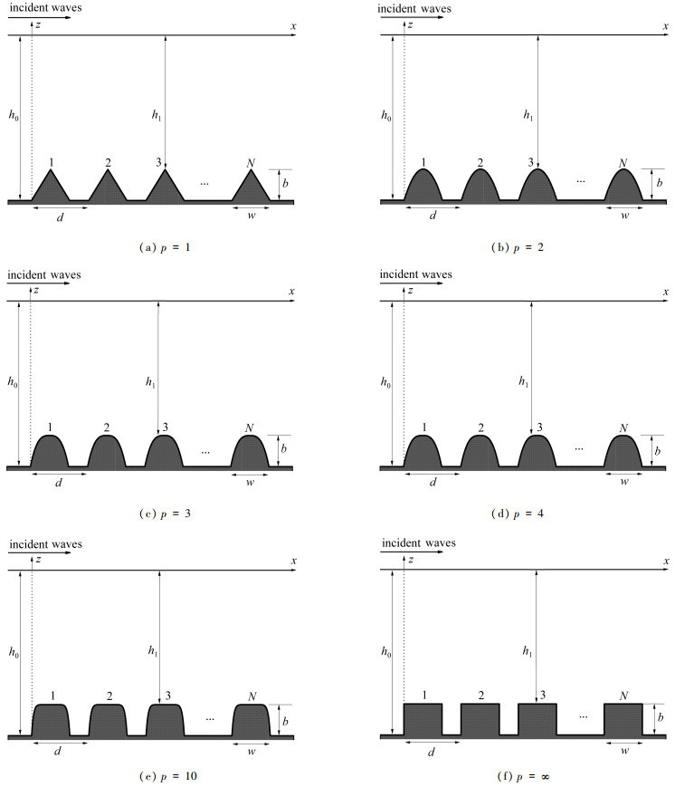 该文研究水波越过平整海床上N个p次拟理想人工沙坝组成的周期阵列时出现的零反射(亦即完全透射). 所谓p次拟理想沙坝,是指沙坝上方的水深函数为一个常数加上p次单项式,其中p为正整数. 研究表明,若沙坝关于最深水深的相对高度远小于1,则水波越过p=1的拟理想沙坝(即三角形)周期阵列时产生遗传性零反射的条件是沙坝宽度正好为入射波半波长的正偶数倍. 随着p增加,水波越过p次拟理想沙坝周期阵列时产生遗传性零反射的相位向低频移动. 当p趋于无穷,p次拟理想沙坝退化为矩形沙坝,此时产生遗传性零反射的条件是沙坝宽度正好为入射波半波长的正整数倍. 此外,任意相邻Bragg共振峰之间共生性零反射的个数为N-1,且这N-1个零反射恰好为第二类Chebyshev多项式UN-1(cos(πx))的全部零点. 若沙坝关于水深的相对高度不是很小,则相邻Bragg共振峰之间共生性零反射的个数仍为N-1,且这些零反射的相位近似等于UN-1(cos(πx))的N-1个零点再减去前后两个共振峰相位下移量的平均值,而后者可通过修正Bragg原理估算. 但对于遗传性零反射的相位,目前仍无有效办法进行预测. 无疑,本研究丰富了对海床上周期排列的人工沙坝激发的Bragg共振反射现象的理解,并在海岸保护和波浪能提取等方面具有潜在应用价值.