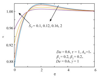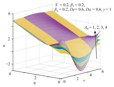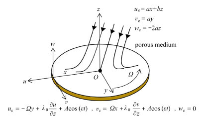 研究了多孔介质中Maxwell流体在具有振荡速度的旋转圆盘上的非稳态斜驻点流动问题. 首先,考虑了流体的滑移效应,利用改进的Darcy-Maxwell本构关系和斜驻点流动特征建立了多孔介质中的非稳态流动模型,并通过求解常微分方程对压强项进行了修正. 接着,利用合理的相似变换将控制方程转化为耦合的无量纲偏微分方程组,用同伦分析方法首次得到了模型的近似解析解. 最后,绘制了随圆盘转速变化的二维流线图、在不同倾斜参数下的三维流线图、不同振幅下随时间变化的速度图,以及速度随其他参数变化的图形. 结果表明:Deborah数的增加使流体受离心力影响加大,流动加速;Darcy参数增大导致了多孔介质的孔隙增多,流速增加;增大滑移参数,一方面会减小圆盘附近流体受到的阻碍,促进流体流动,另一方面会减小离心力对远离圆盘的流体的影响,减缓流体流动. 这些结果为旋转涂层、薄膜制备等相关领域的进一步研究提供了理论指导.
