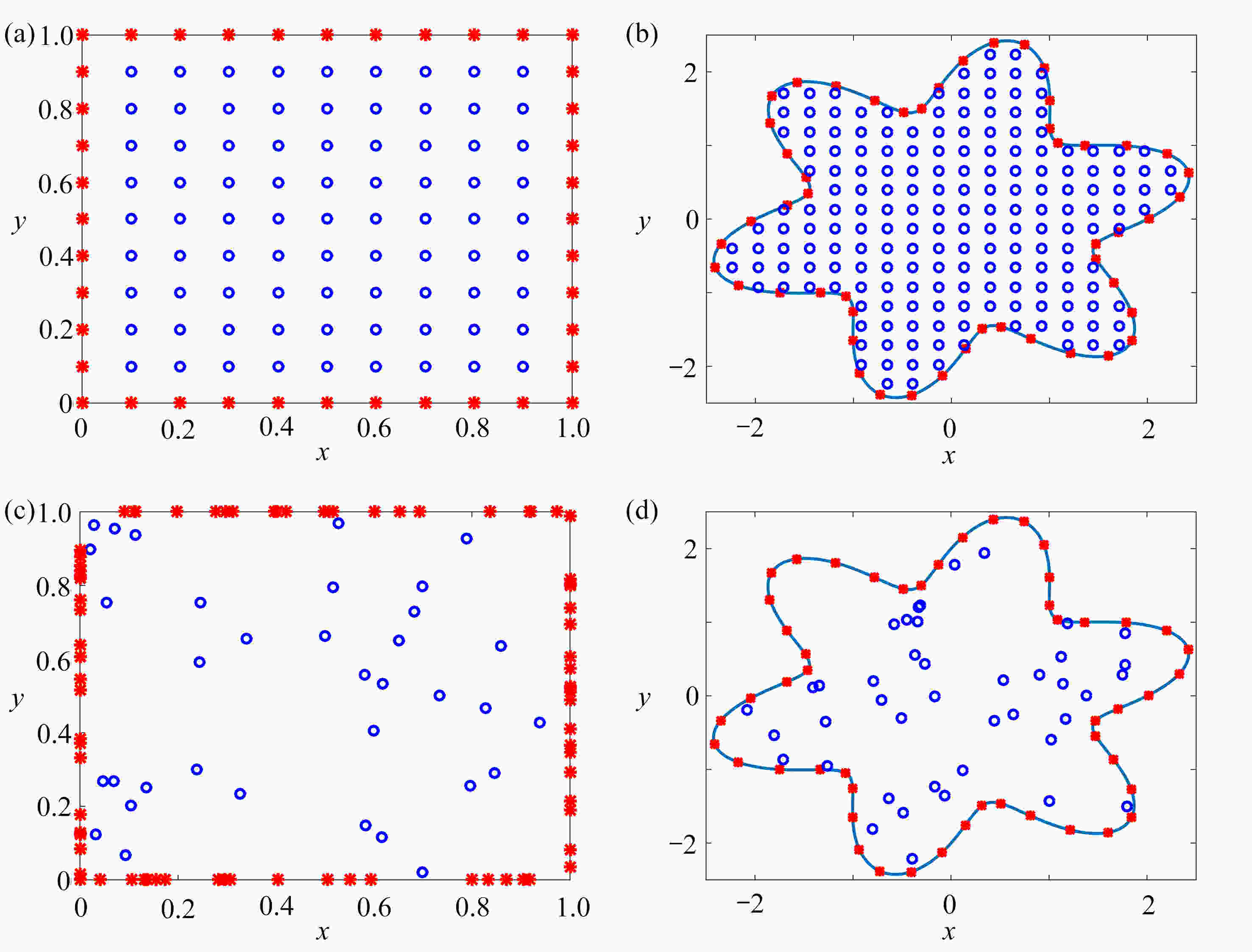 图 1 配点图:(a) 正方形区域规则取点;(b) 星形区域规则取点;(c) 正方形区域随机取点;(d) 星形区域随机取点(篮圈:内点;红星:边界点)