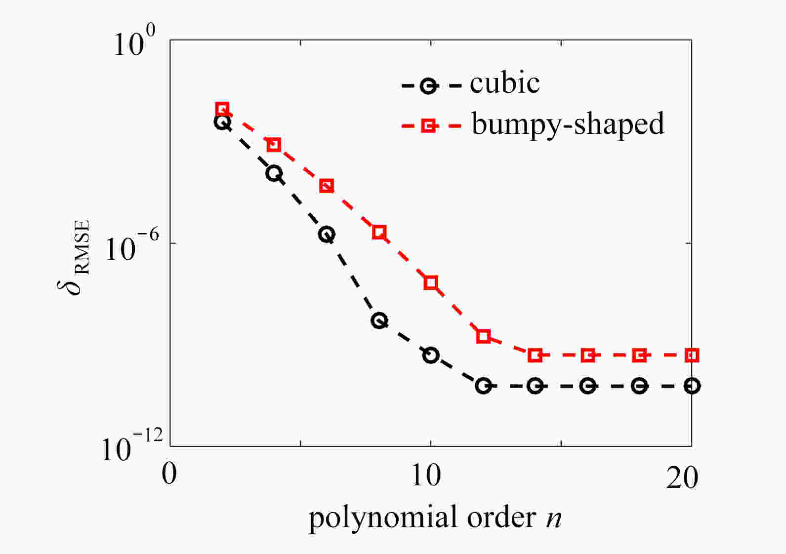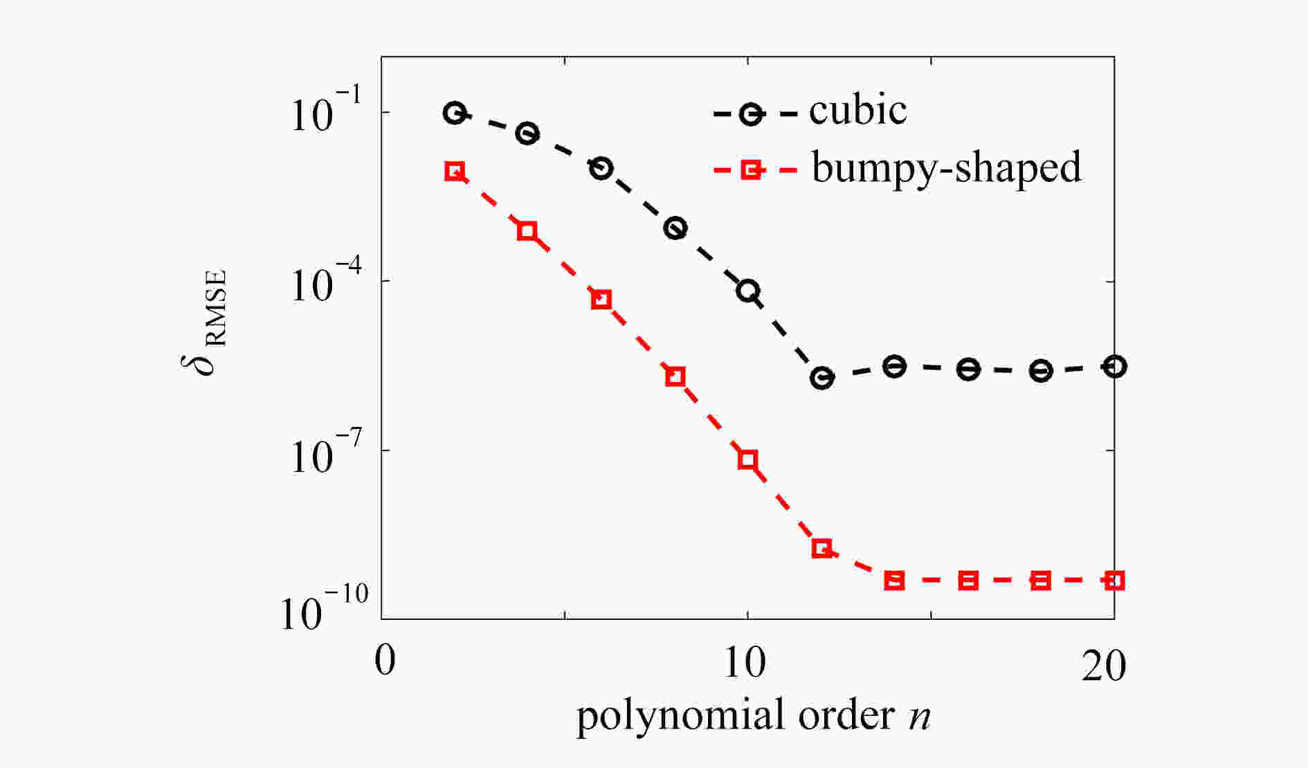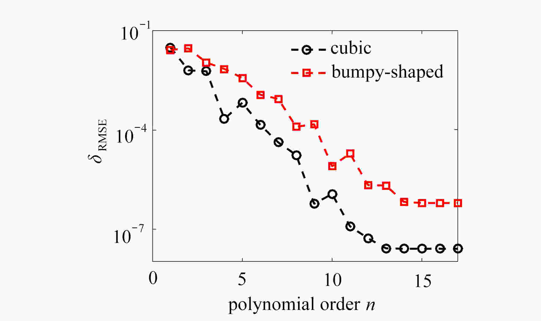 $n_{{{\rm{i}}}}=3\;819,\; n_{{{\rm{d}}}}=5\;220,\; n_{{{\rm{t}}}}=1\;919, \;{\tau}=1$ for cubic and bumpy-shaped domainsorder cubic $ {\delta_{\rm{RMSE1} } }$ bumpy-shape $ {\delta_{\rm{RMSE2} } }$ CPU time t/s 4 2.14E−2 8.22E−2 0.454 6 2.04E−2 7.70E−2 3.418 8 2.02E−2 5.53E−2 23.440 10 2.00E−2 5.51E−2 126.793 表 3