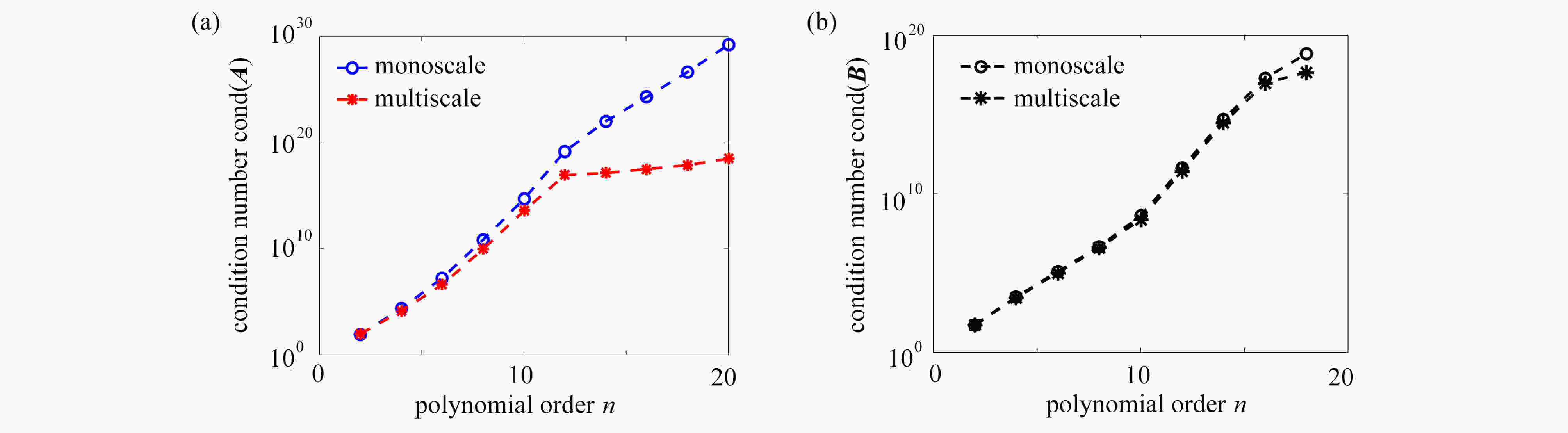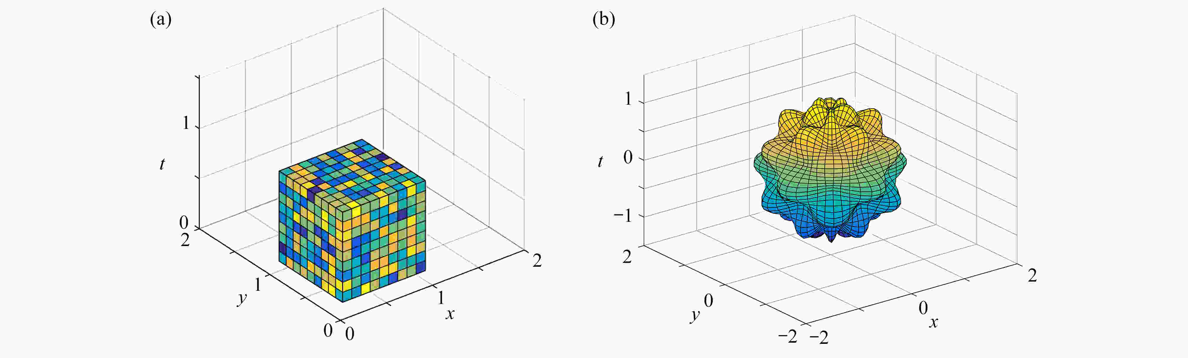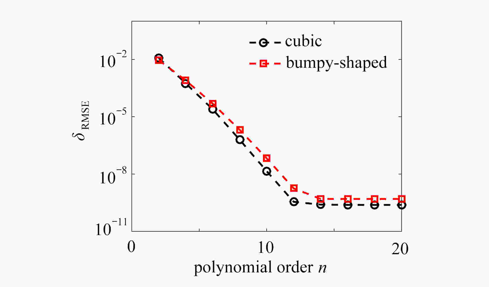 $n_{{{\rm{i}}}}=3\;819,\; n_{{{\rm{d}}}}=5\;220,\; n_{{{\rm{t}}}}=1\;919, \;{\tau}=1$ for cubic and bumpy-shaped domainsorder cubic $ {\delta_{\rm{RMSE1} } }$ bumpy-shape $ {\delta_{\rm{RMSE2} } }$ CPU time t/s 4 2.14E−2 8.22E−2 0.454 6 2.04E−2 7.70E−2 3.418 8 2.02E−2 5.53E−2 23.440 10 2.00E−2 5.51E−2 126.793 表 3