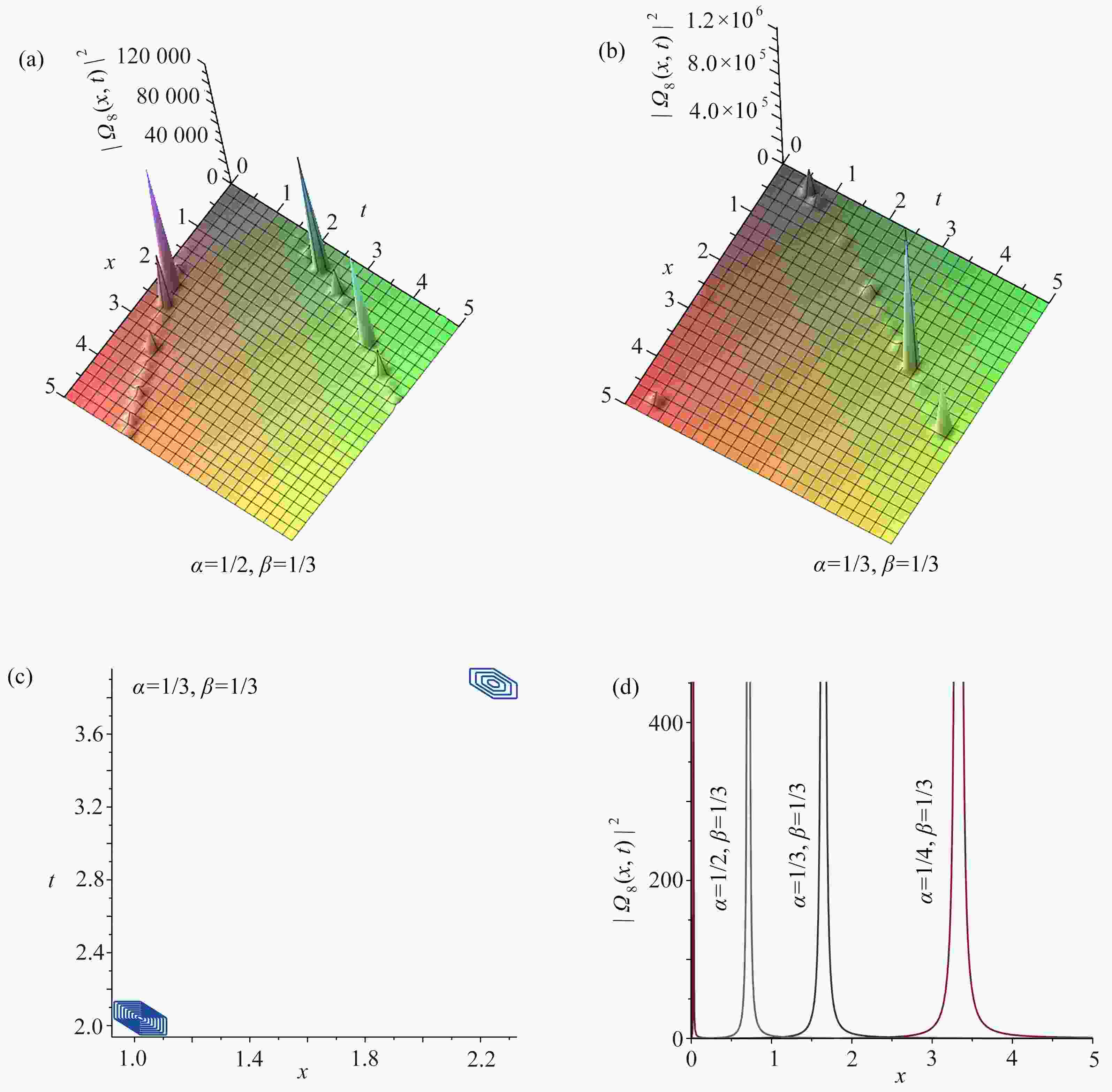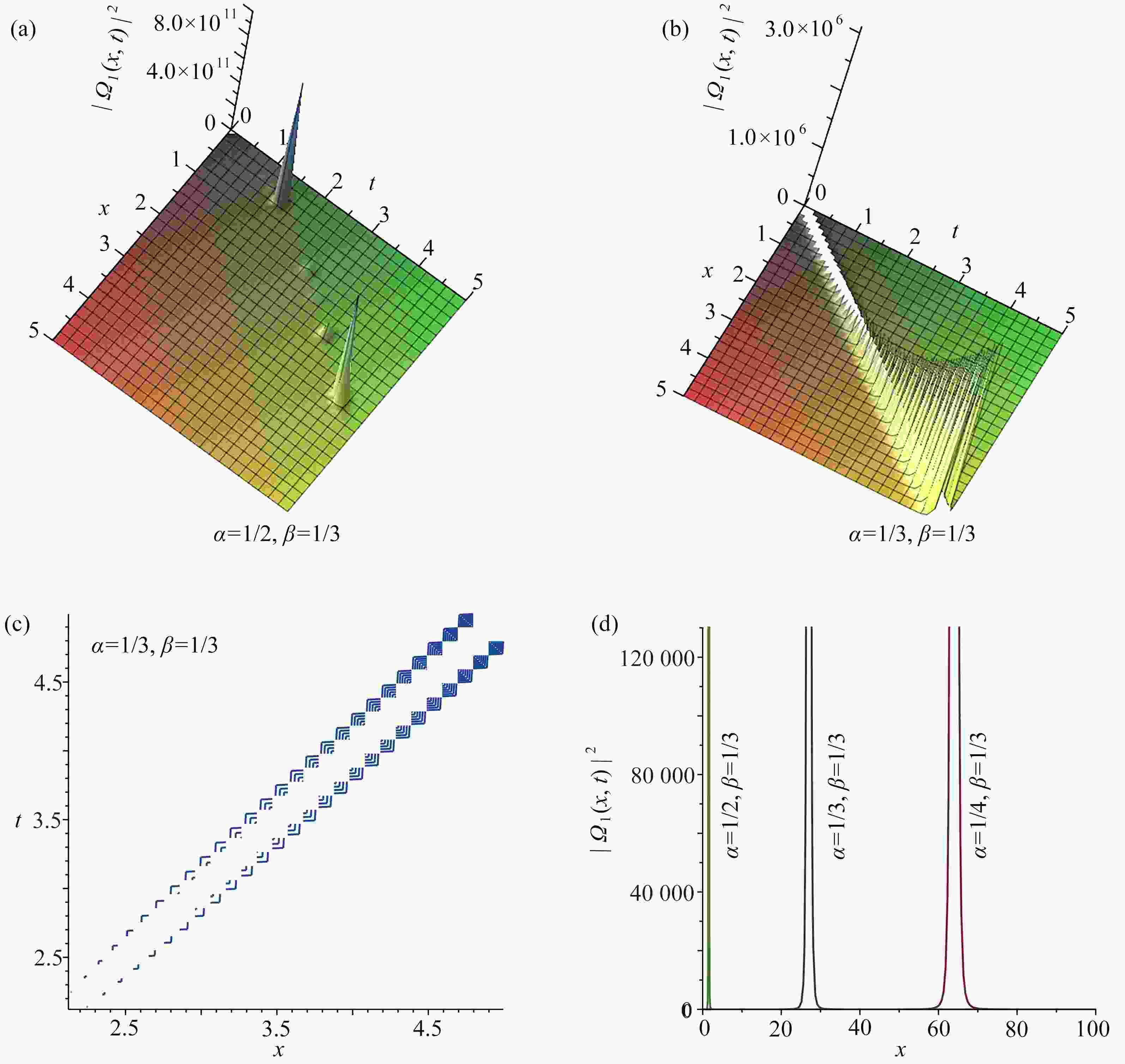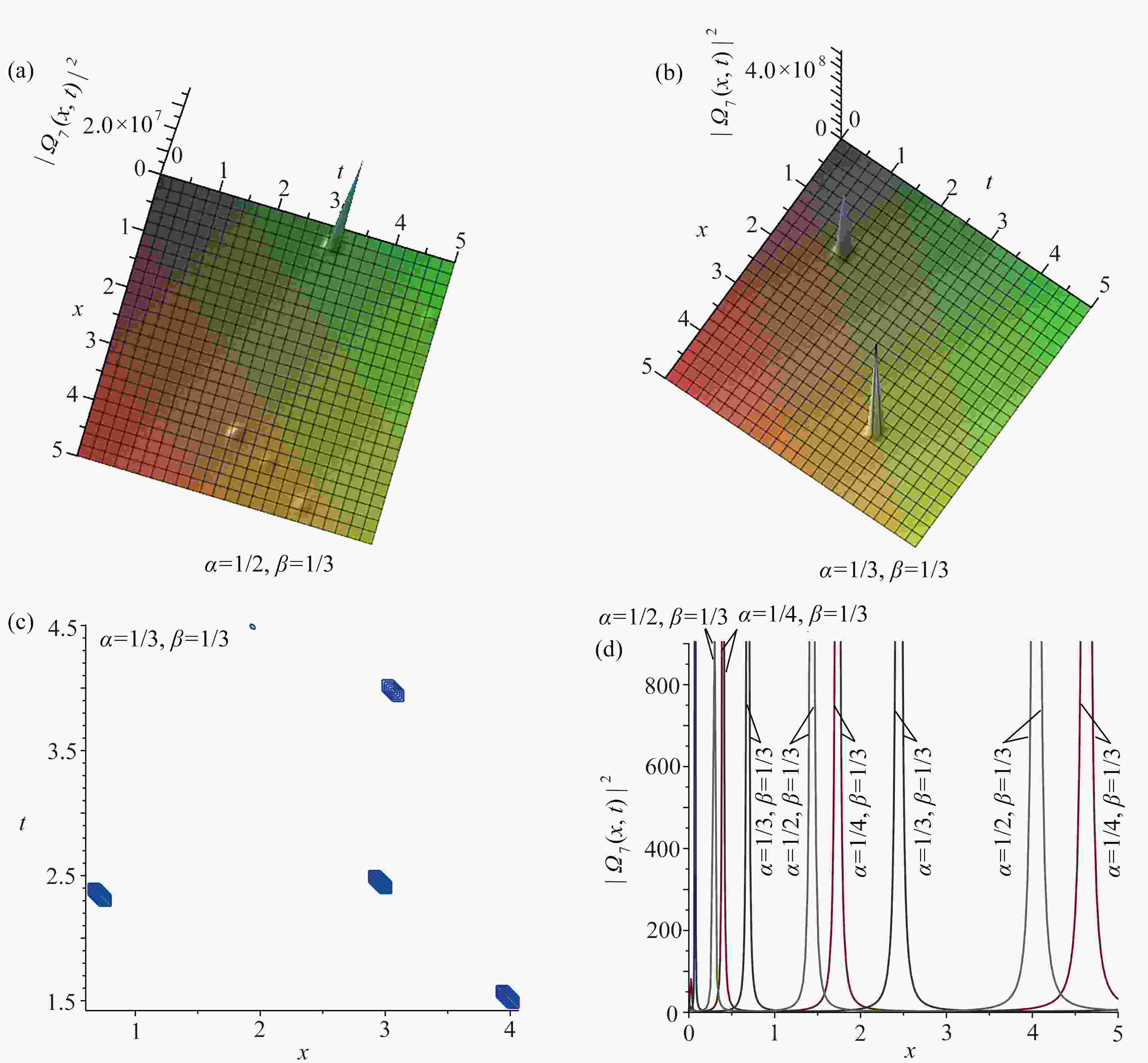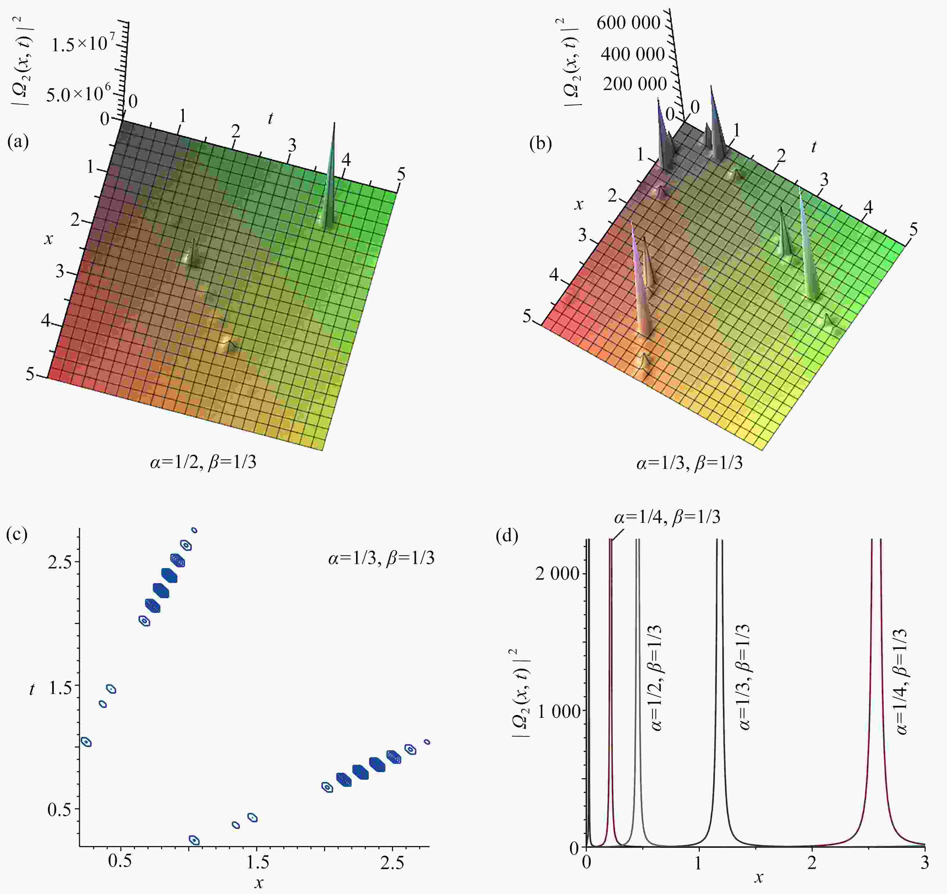 图  5  ${\left| {{\varOmega _5}(x,t)} \right|^2}$取不同分数阶导数值时的三维图,图5(b)对应的等高线图,以及$ t = 3 $${\left| {{\varOmega _5}(x,t)} \right|^2}$关于$ x $的截面图:(a) $\alpha=1/2, \beta=1/3,{\left| {{\varOmega _5}(x,t)} \right|^2}$的三维图; (b) $\alpha=1/3, \beta=1/3,{\left| {{\varOmega _5}(x,t)} \right|^2} $的三维图; (c) 图5(b)的等高线图; (d) 当$ t = 3 $${\left| {{\varOmega _5}(x,t)} \right|^2}$关于$ x $的截面图