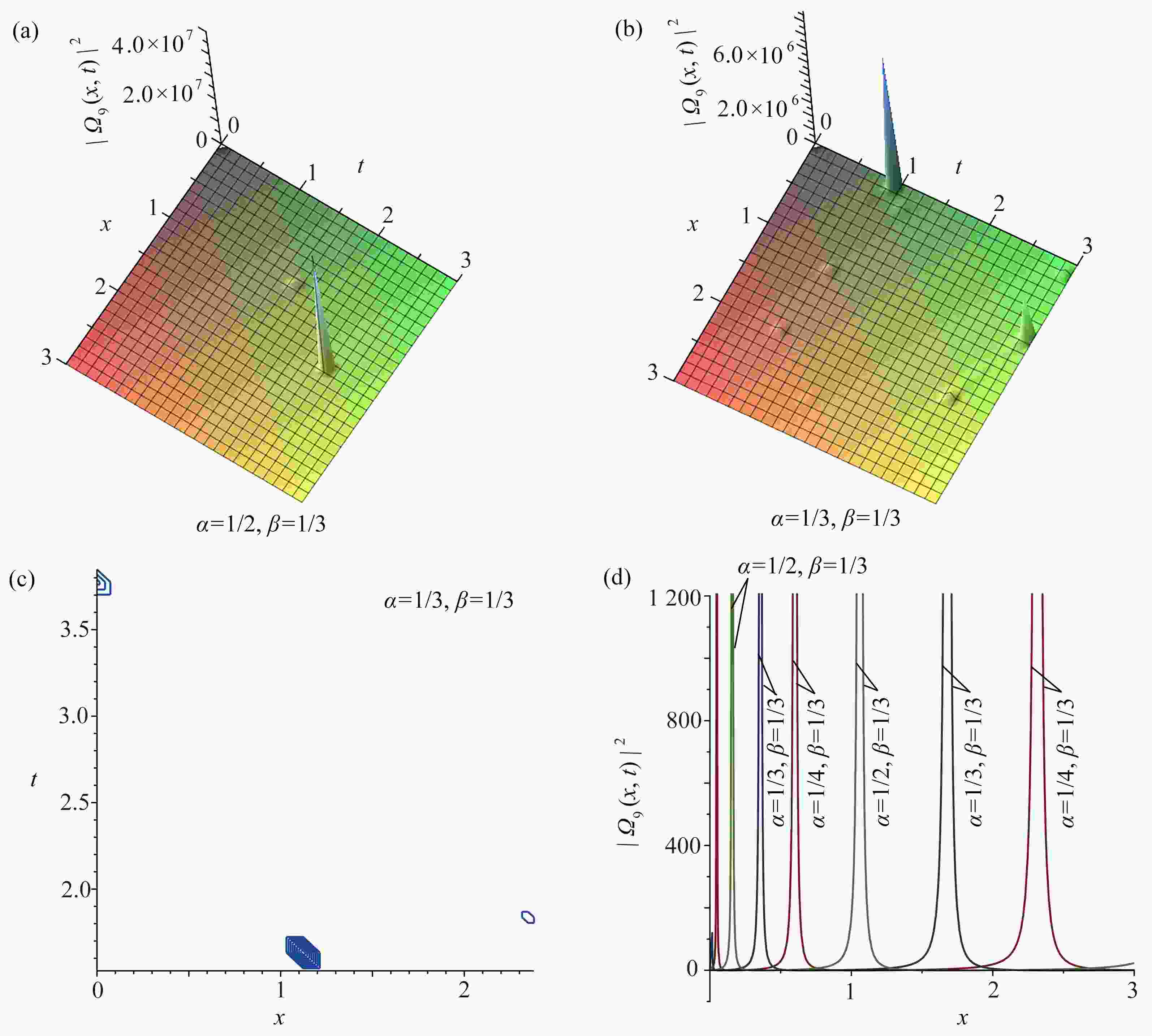图  9  ${\left| {{\varOmega _9}(x,t)} \right|^2}$取不同分数阶导数值时的三维图,图9(b)对应的等高线图,以及$ t = 3 $${\left| {{\varOmega _9}(x,t)} \right|^2}$关于$ x $的截面图:(a) $\alpha=1/2, \beta=1/3,{\left| {{\varOmega _9}(x,t)} \right|^2}$的三维图; (b) $\alpha=1/3, \beta=1/3,{\left| {{\varOmega _9}(x,t)} \right|^2} $的三维图; (c) 图9(b)的等高线图; (d) 当$ t = 3 $${\left| {{\varOmega _9}(x,t)} \right|^2}$关于$ x $的截面图