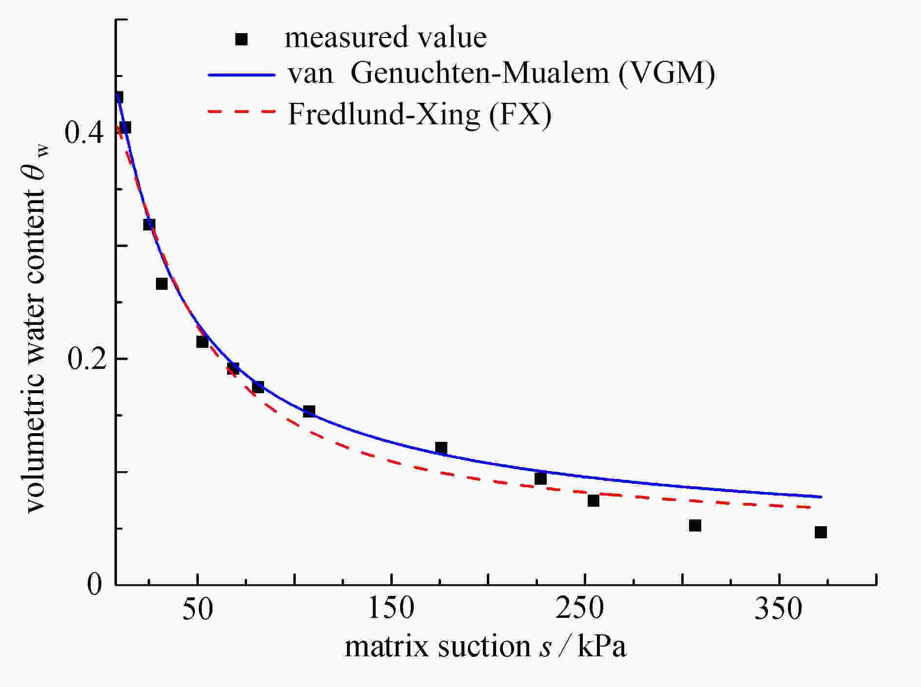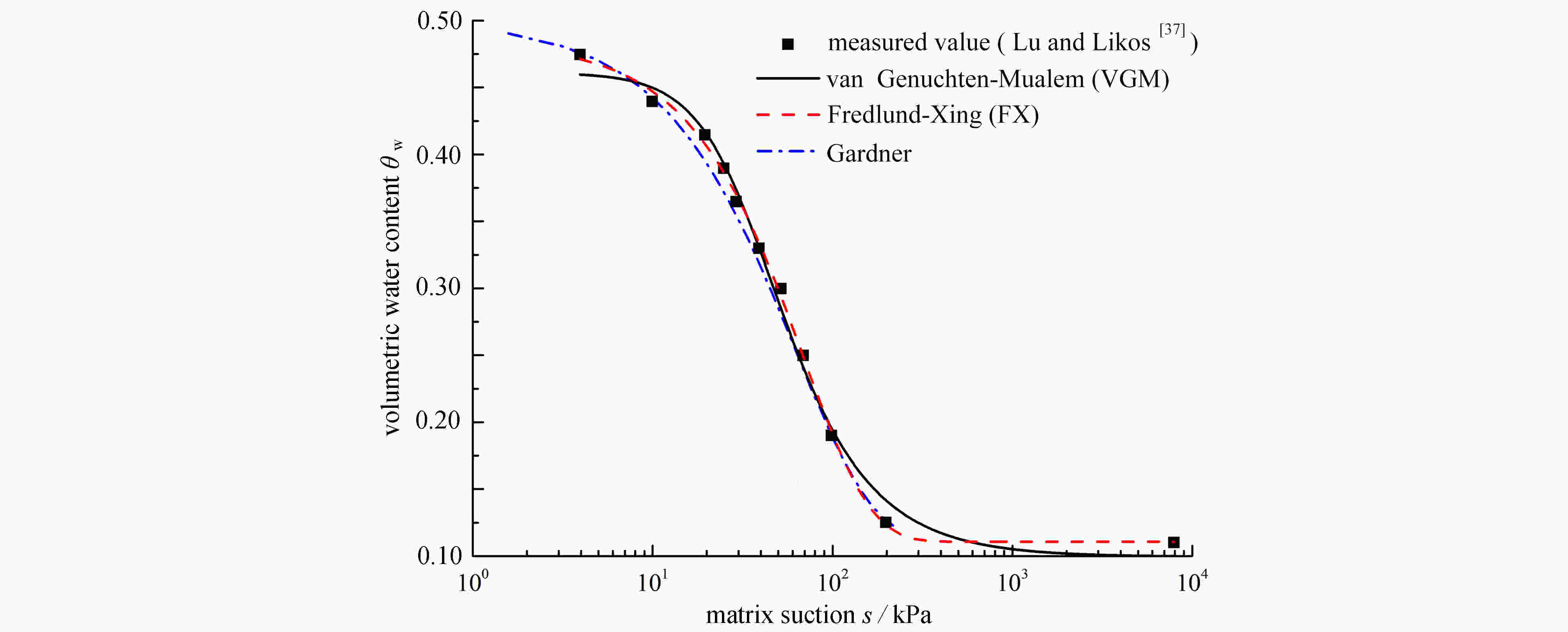 model ${\theta _{\rm{s}}}$ ${\theta _{\rm{r}}}$ $\alpha $ n m Gardner 0.50 0.11 0.016 – – VGM 0.46 0.10 0.028 2.24 – FX 0.48 0.11 2513 1.17 181 表 2 不同模型的拟合参数