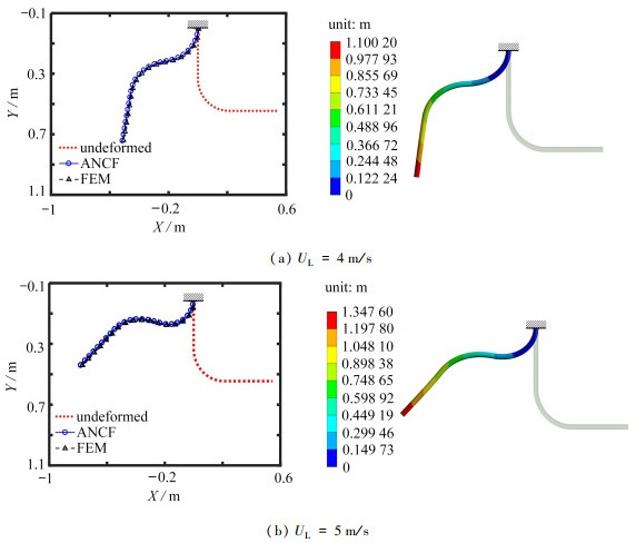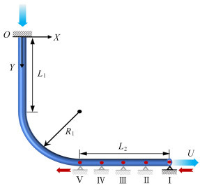 Based on the Euler-Lagrange equations, the absolute nodal coordinate formulation (ANCF) was employed to establish a nonlinear dynamic model for cantilevered L-shaped pipes conveying 2-phase flow. The characteristics of uniformly bubbly 2-phase flow were considered. Firstly, the static deformation results from the theoretical model were compared and validated against the finite element method (FEM), and the effects of the gas volume fraction on pipe static deformation and stability were analyzed. Then, the nonlinear dynamic behaviors of the pipe were studied for different void fractions, with a focus on the effects of void fractions on bifurcation characteristics. Finally, an optimal support design is proposed to suppress pipe vibrations, and minimize both the displacement and strain amplitudes of the L-shaped pipe.