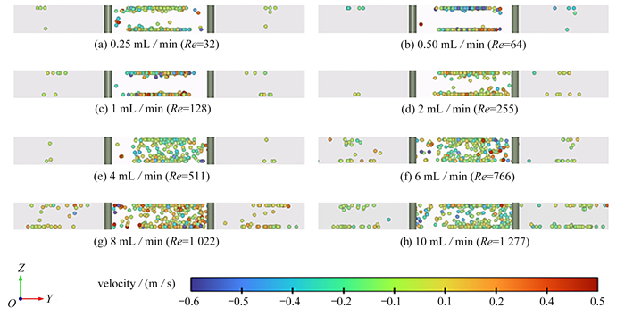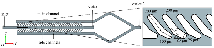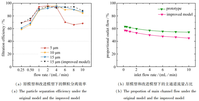 To optimize an efficient biomimetic microfluidic chip for the high-efficiency, high-throughput separation of micron-sized particles such as microplastics, a computational fluid dynamic (CFD) coupled with discrete element method (DEM) numerical approach was employed to systematically investigate the internal flow field and particle separation mechanisms of a biomimetic microfluidic filtration structure. The 4 interesting particle separation mechanisms were summarized: at low Reynolds numbers, particles are separated through inertial focusing effects; at high Reynolds numbers, particles rely on the capture effect of vortices at the leading edge of the valve and the backflow effect between valves at the channel end to form 3 separation mechanisms. Finally, based on the mechanism analysis, the chip structure was optimized by increasing the cross-sectional length of the auxiliary channel, to achieve a maximum improvement of 7.9% in particle separation efficiency, an average reduction of 7.2% in the main channel flow rate, and a maximum increase of 9.4% in the production of clean filtrate. These findings provide a theoretical support for the optimized design of efficient bionic filtration membranes.