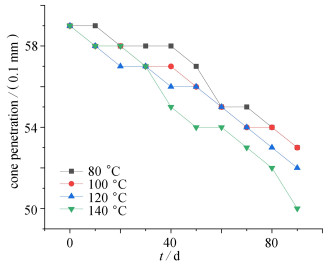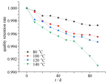 The lubricating grease degradation and aging performance is critical to the reliability of spacecraft deployment mechanisms, moving components, and other related products. Limited research has been conducted on the effects of grease aging on performance and lifespan prediction, with insufficient theoretical support for the application of long-life lubricating grease in spacecraft. The quality change rate was selected as the key performance for aging failure, a time temperature equivalent model based on the quality retention rate of lubricating grease was obtained by means of the Arrhenius equation and the time temperature relationship, which can predict the quality change of lubricating grease under various storage conditions. Key parameters such as the droplet point and the cone penetration were monitored to evaluate the lubricating grease aging performance. The results show that, aging has a significant impact on the droplet point and the cone penetration performance, with a 1% loss rate of the lubricating grease mass indicating a predicted lifespan of 5.4 a at the failure point. In addition, a 4-ball friction test was used to study the lubricating grease friction performance on bearing steel GCr15 under different loads. The test indicate that aging significantly influences the lubricating grease friction coefficient and the wear zone diameter under high loads. The research results and methods provide a basis for understanding the lubricating grease degradation and aging performance, and predicting its lifespan.