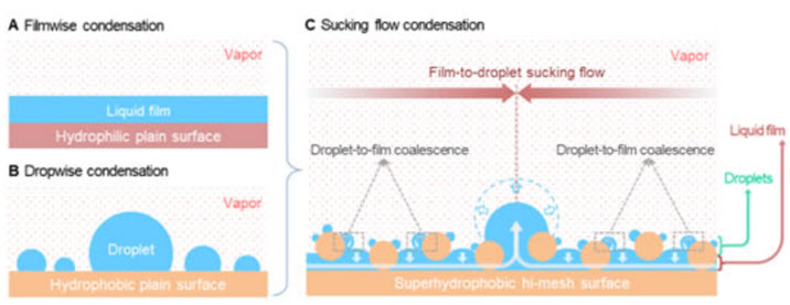 与已有的微纳米结构表面和蒸汽冷凝模式相比,这项研究具有以下亮点:1)通过简单工艺制备了具有复合结构的超疏水铜网表面,具有显著的低成本优势和大规模生产的潜力;2)提出了一种新型的滴-膜混合冷凝模式,通过液膜与液滴的抽吸效应同时促进液滴的生长和移除;3)实现了高效稳定的蒸汽冷凝传热,大大地超出了现有的膜状和滴状冷凝的传热性能。该研究成果一方面提出了一种新型的在高湿度环境下的液滴快速移除模式,拓宽了超疏水表面在自清洁、抗腐蚀、抗菌、减阻和油水分离等界面控制领域的应用;另一方面实现了表面的低成本和高传热性能,有助于将超疏水表面的应用拓展到更广阔的相变传热领域,比如水淡化与回收、防雾与防冰、空调与环境湿度控制以及电子器件的热管理等。(来源:科学网)